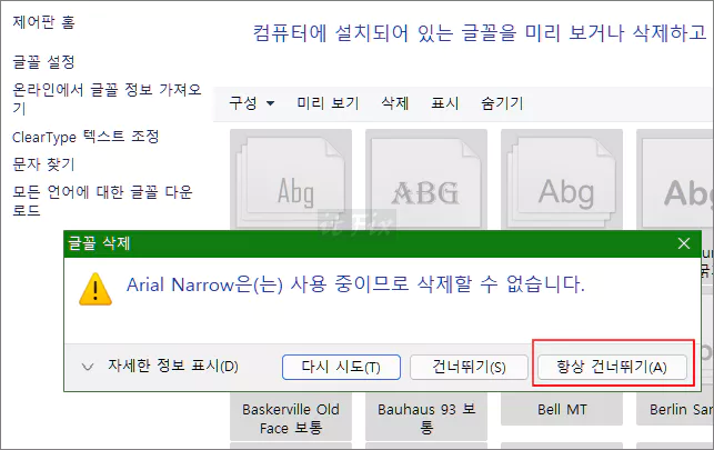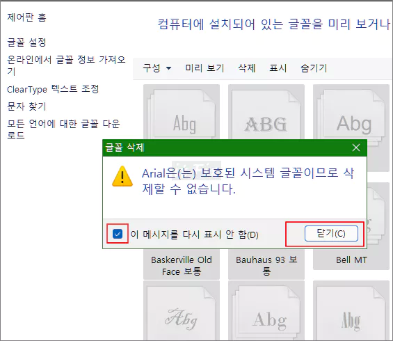삭제 버튼을 누르면 모든 폰트들을 삭제하겠냐고 다시 한번 물어 보게 되는 데 예를 눌러 줍니다. 이어서 윈도우 기본 폰트들의 경우에는 아래의 이미지에서 처럼 보호된 시스템 글꼴들은 삭제할 수 없다는 메시지 창이 열립니다. '이 메시지를 다시 표시 안 함'에 체크해 준 다음 닫기를 눌러 줍니다.