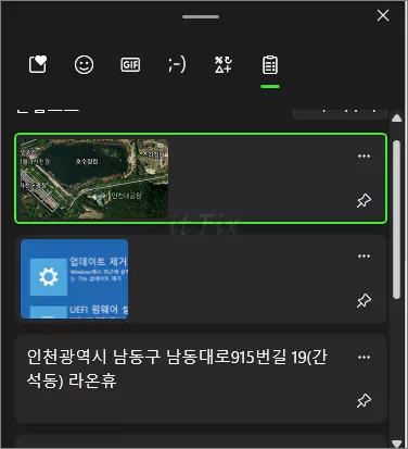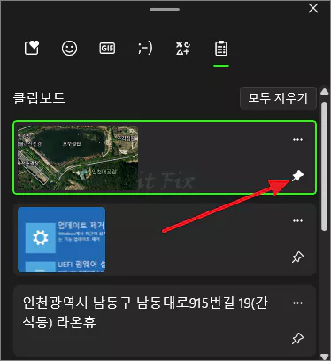 다만, 기본적으로 클립보드에 기록된 복사했던 내용들은 기본적으로 컴퓨터를 재시작하면 모두 사라지는 것이 원칙입니다. 그렇지만, 이중에서도 특히 자주 사용하게될 이미지나 문구 등의 경우에는 컴퓨터가 재시작하더라도 계속해서 사용할 수 있는 방법이 있는 데, 원하는 복사 이미지 또는 텍스트를 고정하면 됩니다.