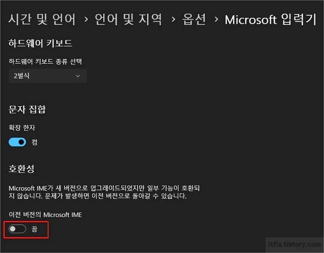 다만, 최근 윈도우 업데이트에서 IME 또한 업데이트되었는데 최신 버전의 IME가 설치된 시스템에서는 마우스 우클릭이 작동하지 않을 수 있습니다. 이럴 경우에는 윈도우 설정의 시간 및 언어 > 언어 및 지역 > 한국어 언어 옵션(3점 클릭) > 마이크로소프트 키보드 옵션(3점 클릭)에 들어가서 이전 버전의 IME 스위치를 켬으로 설정하면 IME의 마우스 우클릭 설정이 가능해집니다.