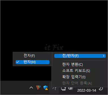 이제 한영 변환 도구 아이콘을 마우스 우클릭한 다음 전/반자(F)를 클릭하고 반자(H)에 체크해 주면 수정 작업이 끝나게 됩니다.