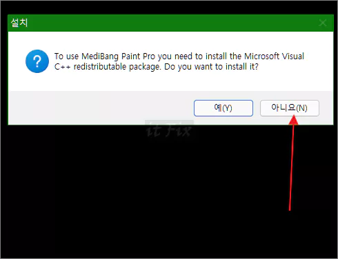 메디방 페인트의 설치를 시작하게 되면 거의 예외 없이 비주얼 C++ 오류를 경험하게 됩니다. 'To use MediBang Paint Pro you need to install the Microsoft Visual C++ redistributable package. Do you want to install it?'라는 설치 오류 팝업 창이 뜨게 되는 데, 얼핏 보면 예를 눌러 비주얼 C 패키지 일부 요소를 설치해야 할 것 같은 느낌적인 느낌이 듭니다.
