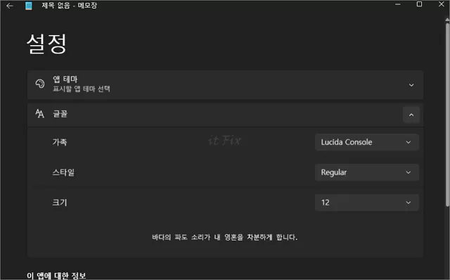 현재 윈도우 11의 메모장(11.2112.32.0 버전)에 적용되는 기본 글꼴은 Lucida Console이라는 글꼴입니다. 크기는 기본값으로 12 포인트가 적용되어 있습니다.