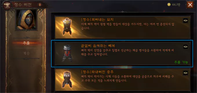 정수 이전 NPC를 클릭하고 추출을 선택한 다음 옵션만 빼올 인벤에 있는 전설 아이템의 부위를 선택합니다. 아이템들중 추출 가능이라고 적혀있는 아이템이 보인다면 추출을 진행해 해당 전설 옵션을 박제해 둡니다.