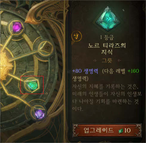 다소 스트레스를 받더라도 완료하고 나면 아래의 이미지에서 처럼 생명력을 올려주는 노르 티라즈의 지식을 그릇으로 호라드림 유산에 추가할 수 있습니다.