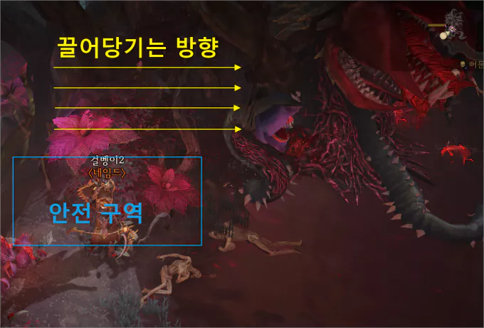 이 몬스터 공략중 가장 큰 힘든 점은 피가 800대로 빠지면 그 이후부터는 주기적으로 캐릭터를 끌어당긴다는 점입니다. 핏빛 장미 좌측 상단의 비교적 안전한 장소에서 원거리로 피를 빼는 데는 무난하게 진행되지만 800대 이하에서 끌려가는 사람이 없어야 한다는 점이 가장 큰 힘든 점입니다. 이유는 한 명이라도 끌려가면 몬스터의 피가 다시 채워지기 때문입니다.