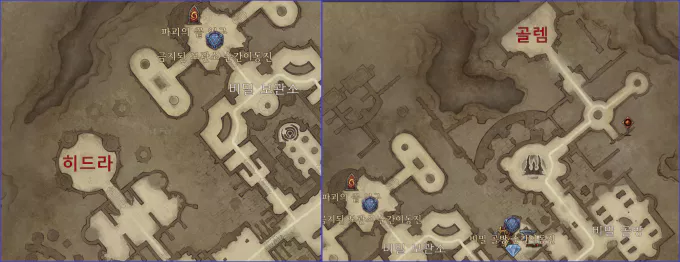 도서관 맵에서 왼쪽 상단에서는 히드라가 나오고 오른쪽 상단에서는 골렘이 나오게 됩니다. 아래쪽의 이미지를 참고하시기 바랍니다.