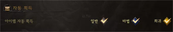 4. 자동 획득 옵션 설정 부분이 보이면 일반, 마법, 희귀 아이템중 자동 획득으로 설정하고 싶은 옵션에 체크하면 작업이 끝납니다. 이 옵션의 설정으로 좀 더 편리하게 플레이하시길 바랍니다.