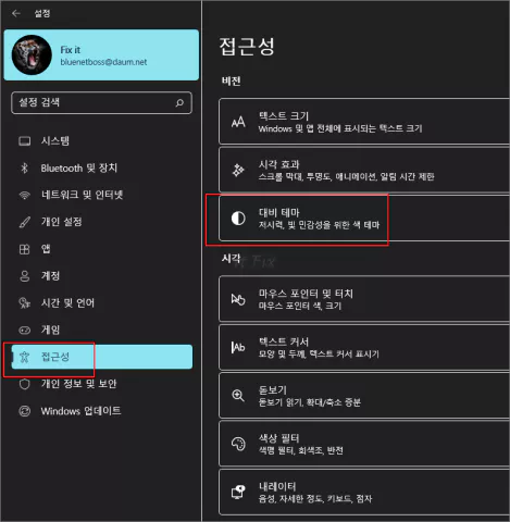 - 윈도우 설정 > 접근성 > 대비 테마(고대비)