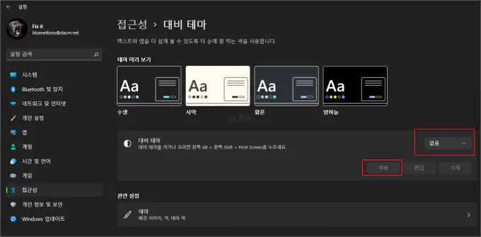 윈도우11에서는 대비 테마를 클릭해 해당 설정으로 들어간 다음 대비 테마를 없음으로 설정하고 적용을 누르면 원래의 화면으로 돌아가게 됩니다. 마찬가지로 윈도우 10 이하의 운영체제에서 고대비로 설정된 경우에도 개인 설정 > 배경 > 관련 설정으로 들어가거나, 접근성 설정 부분에서 고대비 설정을 찾아 해제하면 됩니다.