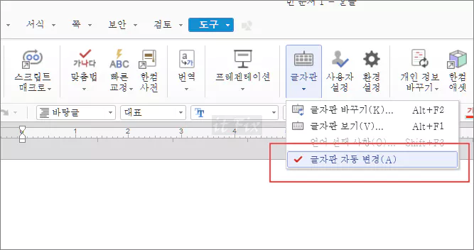 이 기능을 해제하려면 상단의 메뉴에서 '도구 > 글자판 > 글자판 자동 변경'으로 들어간 다음 체크 표시를 해제하면 됩니다.