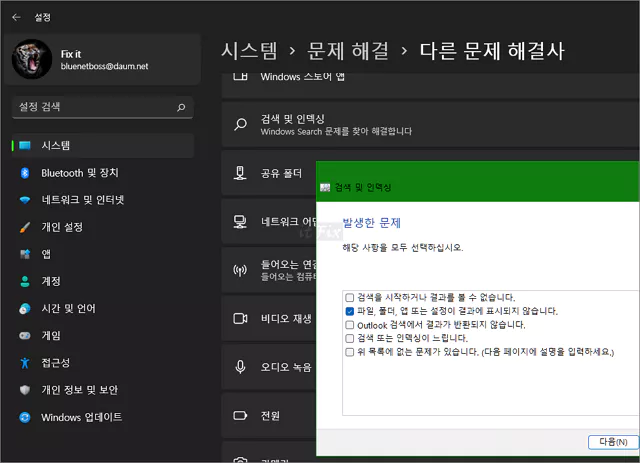 윈도우 설정 > 시스템 > 문제 해결 > 다른 문제 해결사를 차례대로 클릭한 다음 검색 및 인덱싱 문제 해결사를 실행하여 발견되는 문제가 있는지 검토합니다.