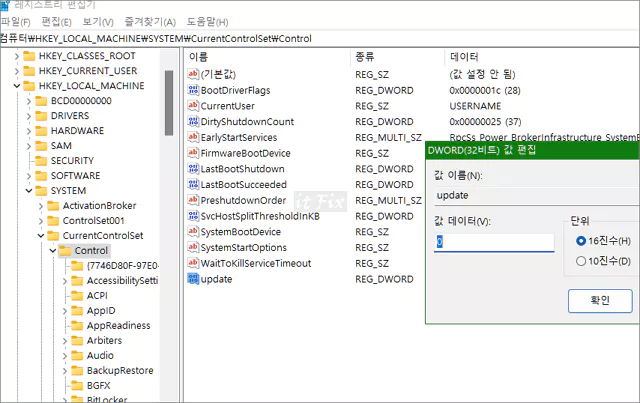 관리자 권한의 레지스트리 편집기가 실행되었다면 < 컴퓨터 \HKEY_LOCAL_MACHINE \SYSTEM \CurrentControlSet \Control > 경로로 들어간 다음 update 키값이 존재하는지 살펴 봅니다. update 값이 없다면 Control 폴더의 우측에서 마우스 우클릭한 다음 새로 만들기 Dword(32비트) 키값을 만들어 주고 값은 16진수 0으로 설정해 줍니다.