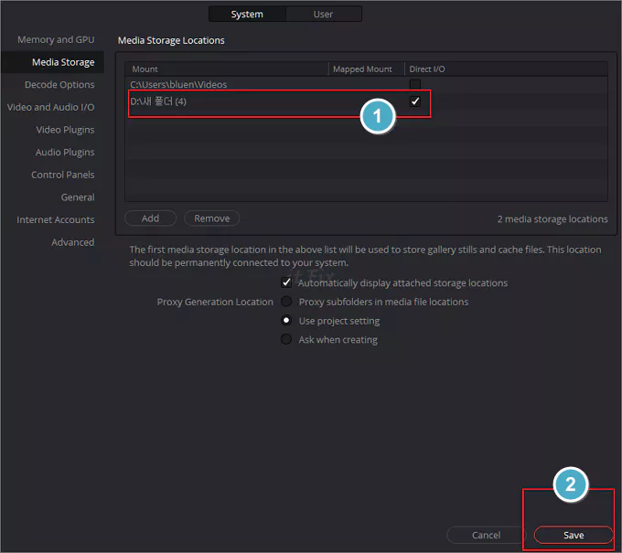다빈치 리졸브의 상단 메뉴중 위 제목의 경로를 눌러 Media Storage 항목으로 들어왔다면 기존의 기본 경로는 체크 표시를 해제하고 하단의 Add 버튼을 눌러 저장하고 싶은 다른 드라이브 등의 새로운 경로에 있는 폴더를 지정해 줍니다. 그런 다음 하단의 Save를 눌러 줍니다.