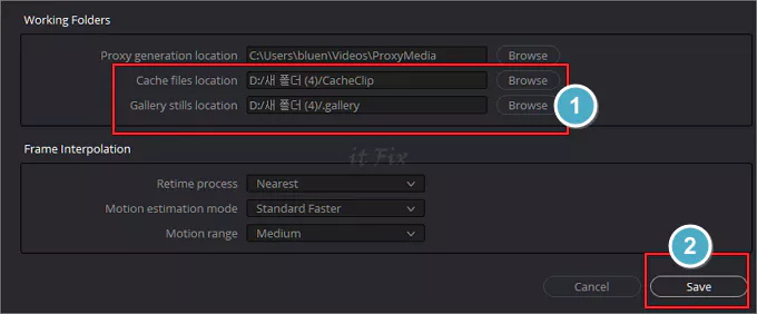 working folders 항목을 찾았다면 Cache files location 항목에서 Browse를 눌러 원하는 경로의 새로운 폴더를 선택해 주고 그 아래의 Gallery stills location에서도 동일하게 변경 작업을 진행해 줍니다.