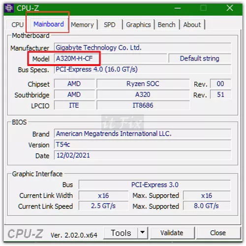 아래 그림에서처럼 실행된 CPU-Z의 메인보드 탭을 선택하면 메인보드 제조사 및 메인보드의 모델명이 나옵니다. 이 PC의 메인보드명인 A320M-H-CF가 보입니다.
