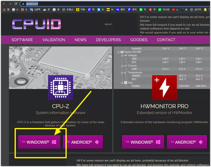 먼저 PC 각 하드웨어 부품에 대한 정보를 알아볼 수 있는 CPU-Z를 다운로드해 설치하도록 합니다. 프리웨어이므로 아래의 제작자 사이트로 이동해 윈도우용 CPU-Z를 다운로드해 설치하면 됩니다.