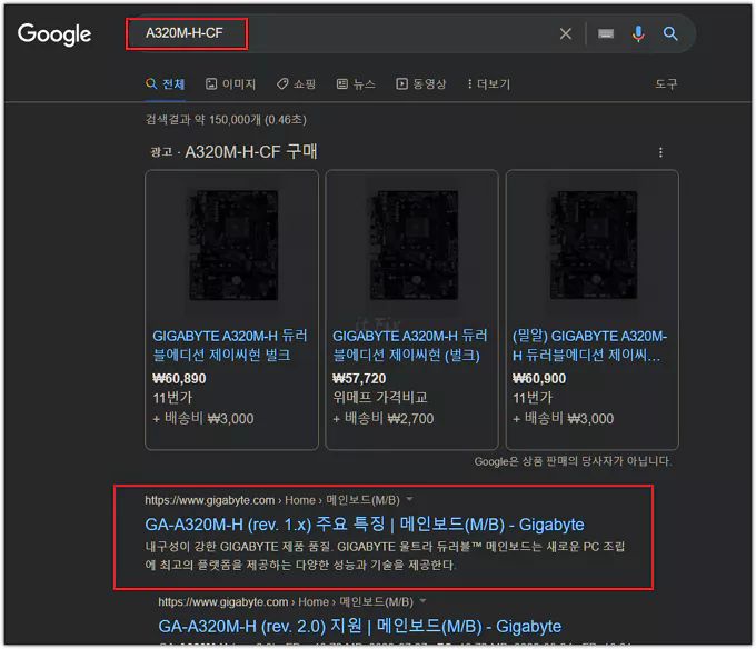 이제 마지막으로 인터넷 브라우저에서 검색창을 열고 A320M-H-CF를 입력하면 검색 결과 중에서 해당 메인보드 제조사의 홈페이지의 매뉴얼 페이지를 찾을 수 있습니다. 링크로 이동합니다.