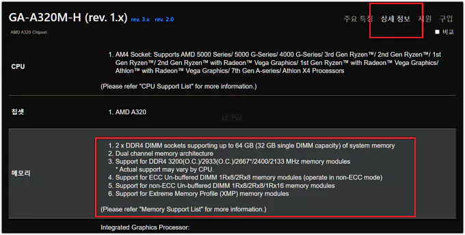 해당 보드의 메뉴얼 페이지에서 상단 메뉴 중 상세 스펙 정보 링크 버튼을 누르고 들어가면 메모리 부분에서 지원 가능한 메모리의 최대 용량을 언급한 부분을 찾을 수 있습니다. A320M-H-CF 모델의 경우에 최대 64기가까지 단일 소켓별로는 최대 32기가까지 인식 가능하다고 언급한 부분을 찾을 수 있습니다. 그러므로 제 PC의 경우에는 최대 메모리를 64기가까지 달 수 있습니다.