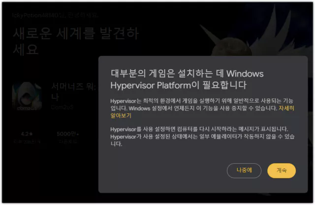 설치가 끝나고 실행하면 윈도우 설정을 바꿔야 한다는 메시지가 보입니다. 이 메시지를 클릭하면 아래와 같은 팝업 창이 열리게 되는 데, 바로 이 부분이 제가 설명하려는 문제가 있다고 보는 부분입니다. 물론 베타 버전에서는 40가지의 게임밖에 서비스하고 있지 않지만, 추후 업데이트를 통해 정식 버전에서 모든 구글 플레이의 앱들이 설치 가능하게 된다면 그때는 또 의외로 문제가 간단할 수도 있을 것 같기는 합니다. 다른 앱 플레이어를 굳이 유지할 필요가 없을 정도로 단점이 없다면 구글 플레이 게임즈를 모두들 선택할 테니까요.
