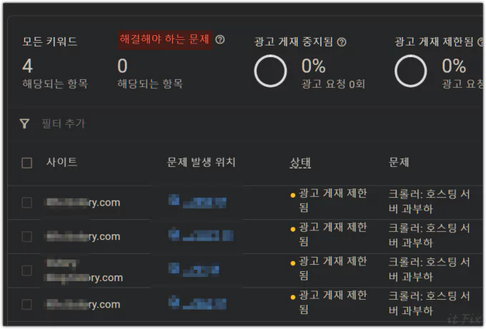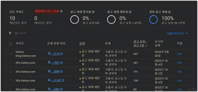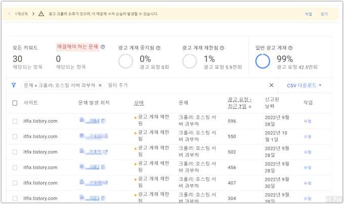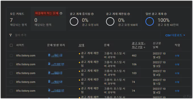 약 3일 후에 약간의 변화가 보이는데, 약 30개에 달하던 서버 과부하 크롤링 오류로 인한 광고 게재 제한 페이지가 10개 정도로 줄어든 모습이 보입니다. 아무것도 손댄것은 없습니다.