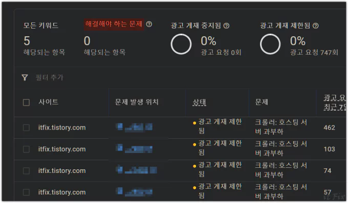 며칠 전부터 티스토리 블로그 내의 수십 개의 페이지에서 동시 다발적으로 '크롤러 오류 : 호스팅 서버 과부하'라는 오류가 발생하고 '해당 페이지에서는 광고가 게재되지 않습니다.'라는 유형의 문제가 발생했습니다.