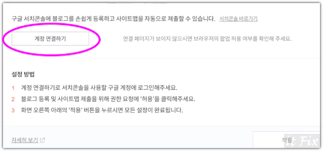 5. 서치콘솔에 블로그가 등록되었습니다라는 메시지가 뜨면 우측 하단의 적용 버튼을 눌러 작업을 마무리합니다.