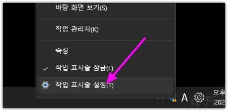 작업 표시줄을 마우스 우클릭한 다음 작업 표시줄 설정을 클릭합니다.
