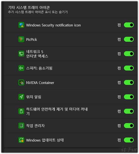 기타 시스템 트레이 아이콘 설정 부분을 열면 윈도우 시작 후 작업 표시줄의 시스템 트레이 영역으로 들어가게 되는 모든 아이콘들의 목록이 보이게 됩니다. 이곳에서 모든 아이콘들 기능을 '켬'으로 설정해 줍니다.