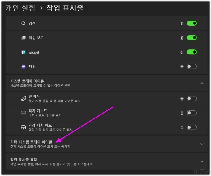 이렇게 하면 윈도우 설정 > 개인 설정 > 작업 표시줄 > 시스템 트레이 아이콘 설정이 있는 부분이 열리게 됩니다. 이곳에서 기타 시스템 트레이 아이콘 항목 부분을 클릭하여 오픈합니다.