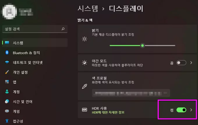 우측의 항목중 HDR 사용 부분의 스위치를 끔으로 만들어 줍니다.