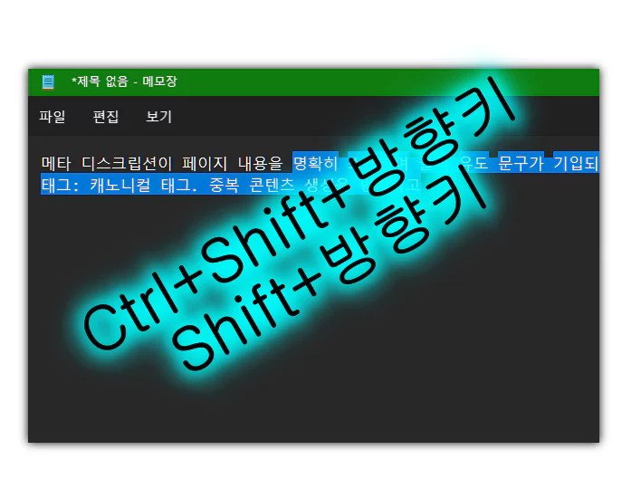 메모장에서 타이핑 또는 문서 편집 작업 도중 문장을 단어 단위로 삭제하거나 글자 단위로 삭제하고자 할 때에 작업량이 많다면 Ctrl+Shift+방향키 또는 Shit+방향키를 사용하면 매우 효율적으로 삭제 작업을 진행할 수 있습니다. 비단 이러한 규칙은 메모장뿐만 아니라 한컴 한글 워드 등의 문서 편집 프로그램에서도 동일하게 사용되는 단축키이므로 알아두면 매우 유용한 단축키라고 할 수 있습니다.