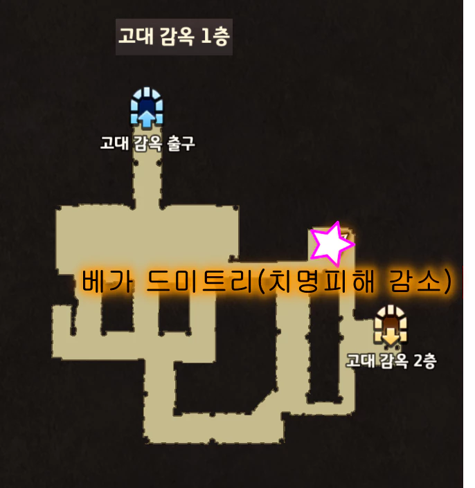 고대 감옥 1층에 있는 클랜칩 보스의 이름은 베가 드미트리이고 치명 피해 감소 효과를 얻을 수 있습니다.