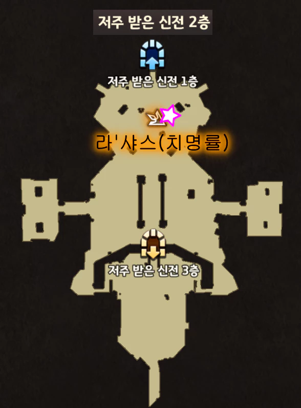 저주받은 신전 2층은 클랜칩 몬스터인 라샤스가 있으며 치명률을 올려주는 크리스탈을 드롭합니다.