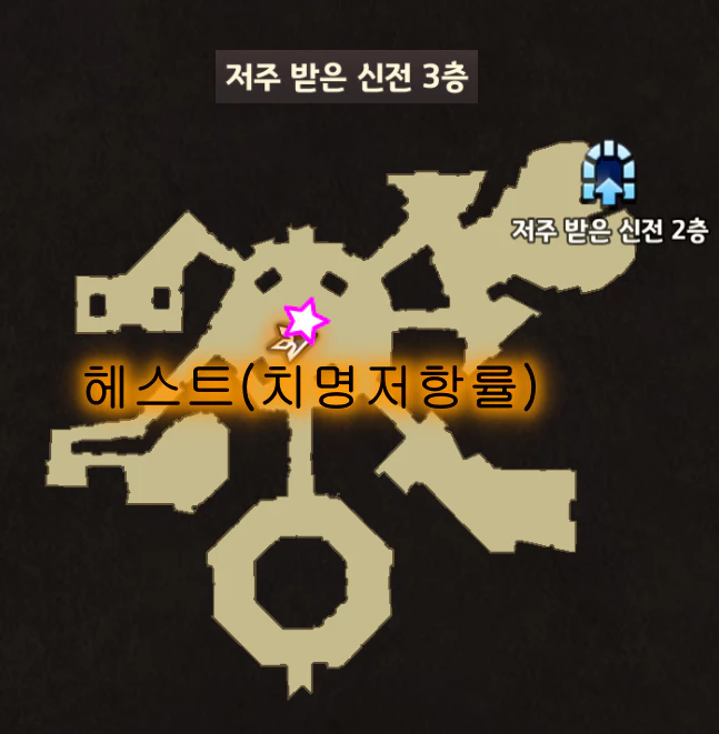 저주받은 신전 3층 역시 2층과 마찬가지로 클랜칩 몬스터가 있습니다. 이름은 헤스트이며, 치명 저항률을 올려 줍니다.