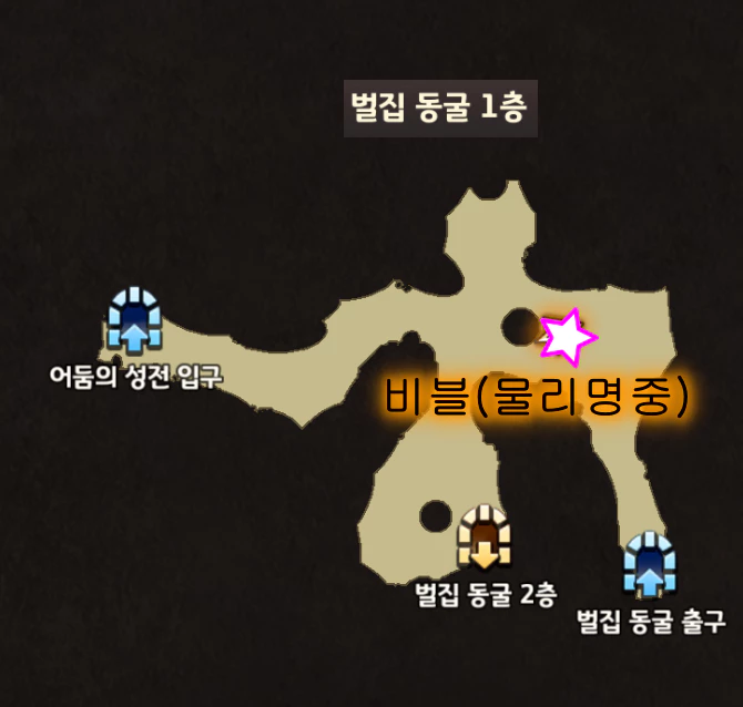 벌집 동굴 1층의 클랜칩 보스 몬스터는 비블이며, 물리 명중 증가 효과 크리스탈을 줍니다. 이 역시 버섯 동굴과 마찬가지로 버섯 동굴 2층에는 클랜칩 보스 몬스터가 존재하지 않습니다.