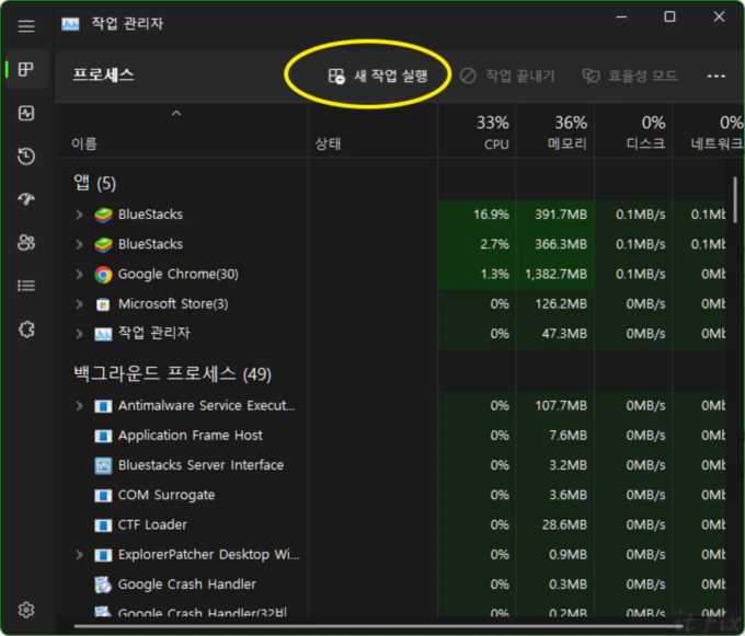 2. 작업 관리자 앱이 실행되면 상단 메뉴의 새 작업 실행 메뉴를 클릭 합니다.