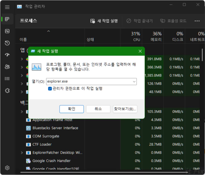 3. 새 작업 창에 explorer.exe를 타이핑한 다음 관리자 권한으로 이 작업 실행에 체크 표시를 해 준 다음 확인 버튼을 눌러 줍니다.