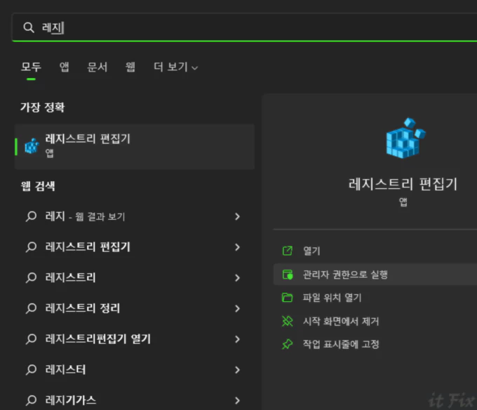 레지스트리 편집기는 윈도우 시작 버튼 옆의 돋보기 모양인 검색 상자를 클릭하고 레지까지만 입력한 다음 레지스트리 편집기를 열면 됩니다.