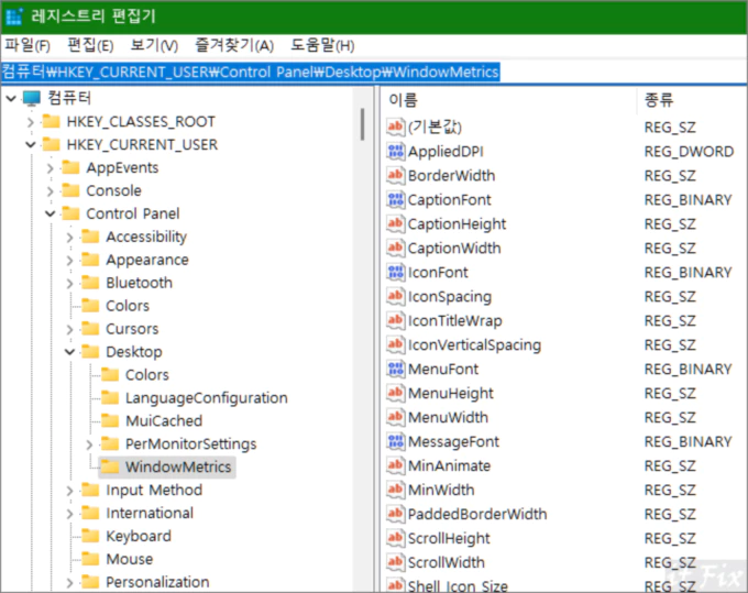 HKEY_CURRENT_USER\Control Panel\Desktop\WindowMetrics