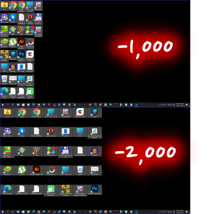 아래의 이미지는 가로 및 세로를 -1,000 및 -2,000으로 적용했을 때의 비교샷입니다. 모든 변경은 변경 후 PC를 재시작해야 적용됩니다.