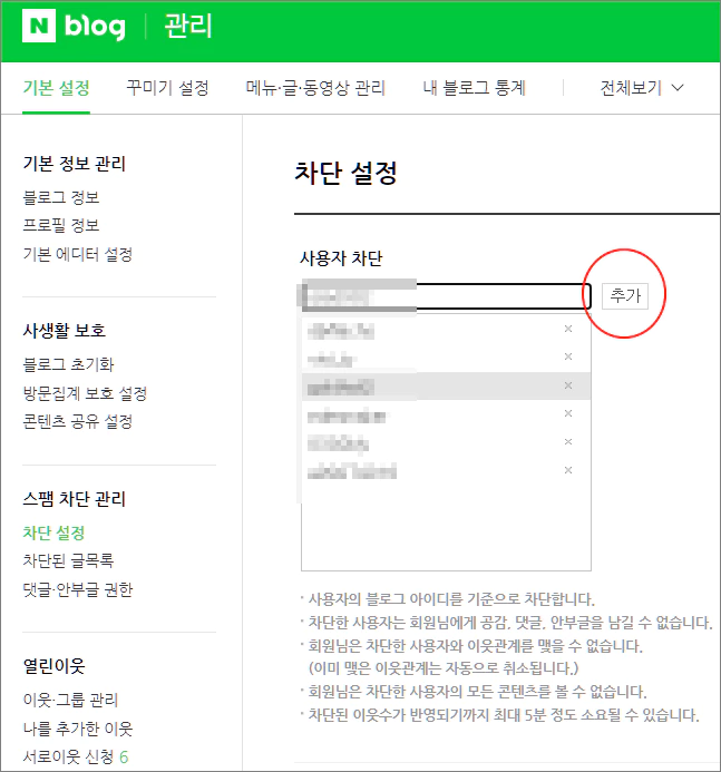 3. 자신의 블로그 관리 및 설정 페이지로 이동한 다음, 기본 설정 > 스팸 차단 관리 > 차단 설정 > 사용자 차단 항목에서 아이디를 붙여 넣기 하고 추가 버튼을 눌러 줍니다.