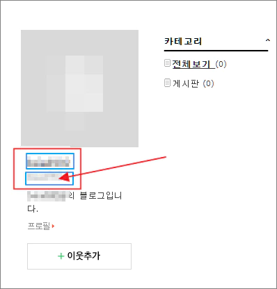 보통 블로그의 가장 왼쪽 박스에 표시되며, 위쪽이 외부로 보여지는 대화명이고 아래쪽이 네이버 아이디입니다. 네이버 아이디를 드래그하여 복사합니다.