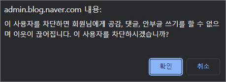 내용은 '이 사용자를 차단하면 회원님에게 공감, 댓글, 안부글 쓰기를 할 수 없으며 이웃이 끊어집니다. 이 사용자를 차단하시겠습니까?' 라는 내용입니다.