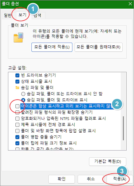폴더 옵션의 보기 탭을 선택하고 고급 설정에서 '아이콘은 항상 표시하고 미리 보기는 표시하지 않음'의 체크 표시를 제거해 줍니다. 이미 제거되어 있다면 체크한 다음 제거해 봅니다. 이후 아래의 적용 및 확인 버튼을 차례대로 누릅니다.
