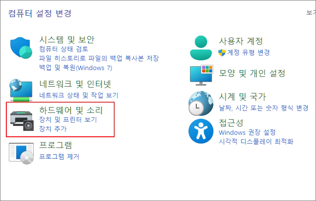 1. 윈도우 제어판을 열고 하드웨어 및 소리 부분을 클릭합니다.