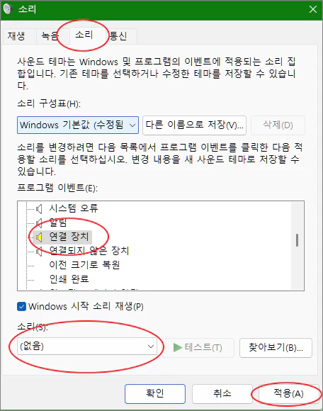 3. 소리 탭을 선택한 다음 프로그램 이벤트 항목 중 '연결 장치' 부분의 소리를 없음으로 설정한 다음 적용합니다.