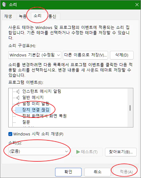 4. 동일하게 소리 탭이 선택된 상태에서 이벤트중 '장치 연결 끊김' 부분의 소리를 없음으로 적용합니다.