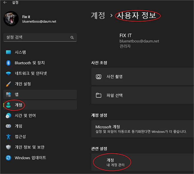 윈도우 설정 > 계정 > 사용자 정보 > 내 계정 관리를 클릭합니다.