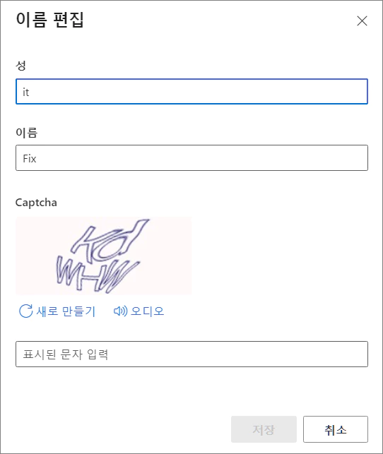 아래와 같은 최종 변경 팝업이 열리면 성과 이름을 변경해 준 다음 Captcha 문자를 입력해 주고 저장을 누르면 윈도우 사용자 이름 변경 작업이 완료됩니다.