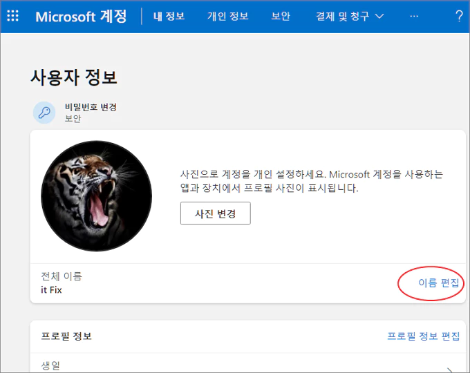 사용자 정보 수정 및 편집 페이지로 이동하게 되면 전체 이름 부분의 우측에 있는 이름 편집을 클릭합니다.
